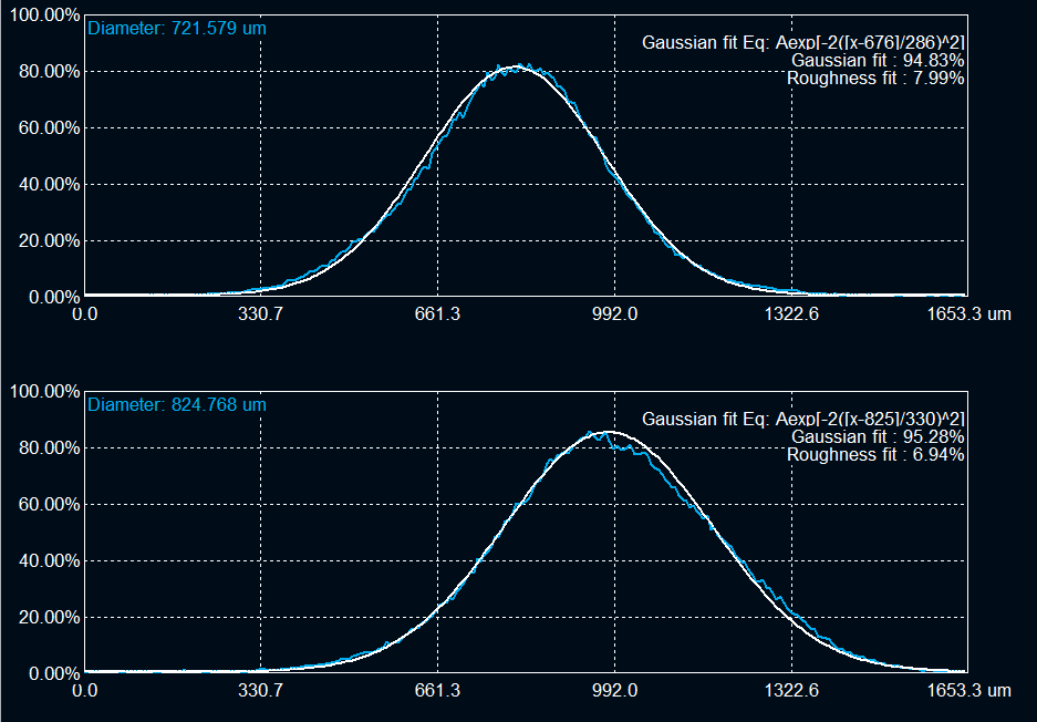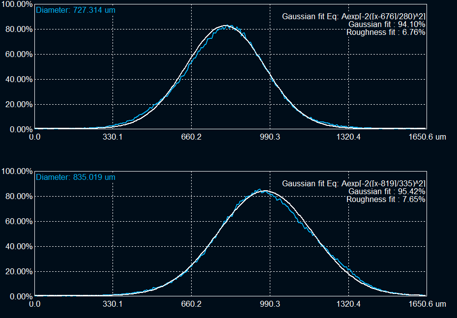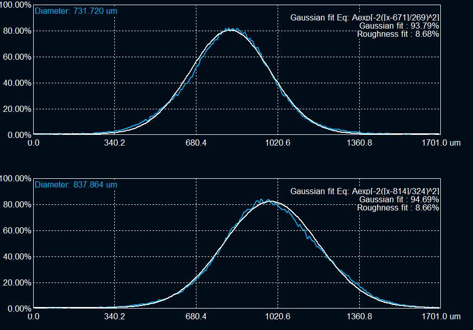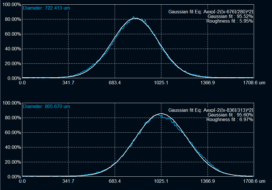 The beam observed is relatively well shaped and fitted up to 50% of amplification is where the shape starts to deform a little and is not well-fitted by a Gaussian. (image attached shows the fit for 60% amplification)