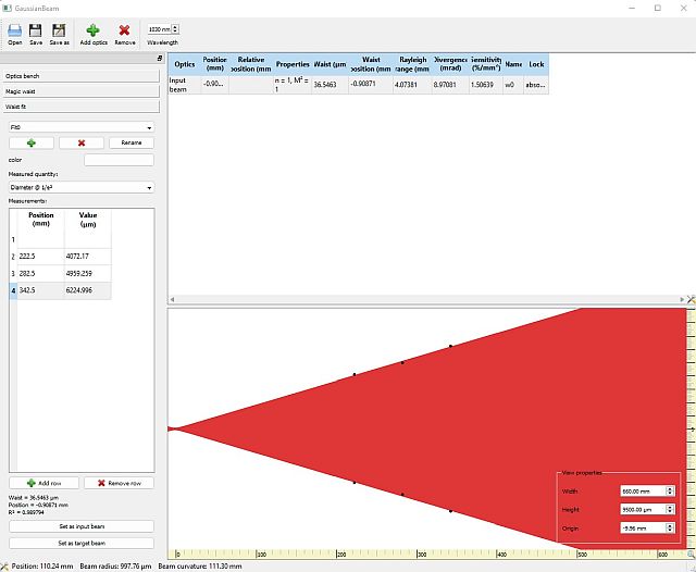 The 3 data points taken of the beam profile are fitted in Gaussian Beam with taking the beam waist at the output of the compressor box.