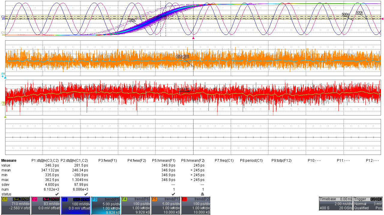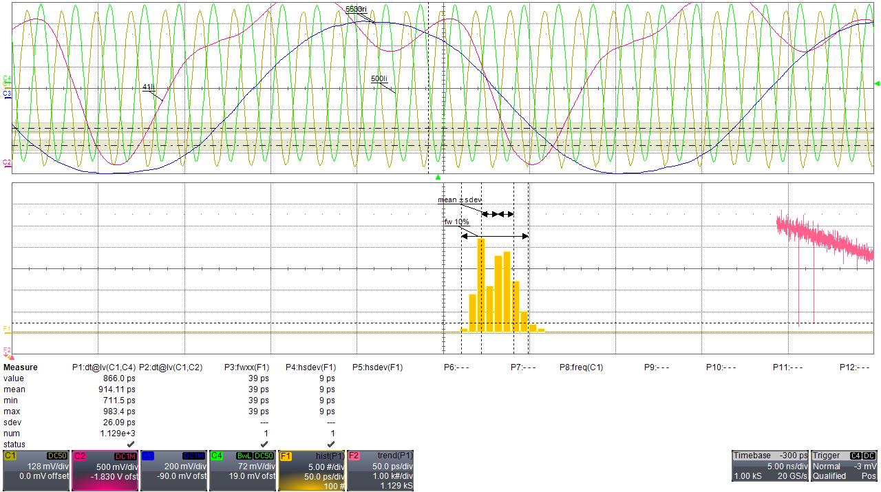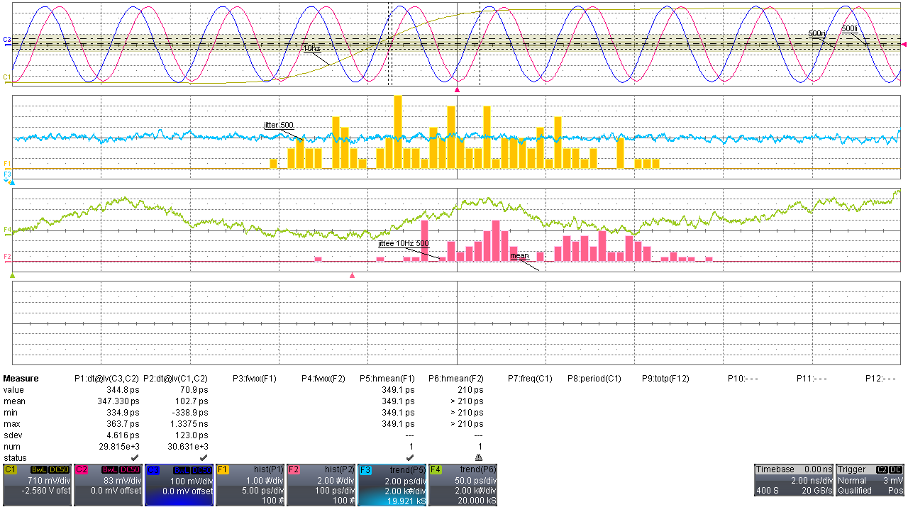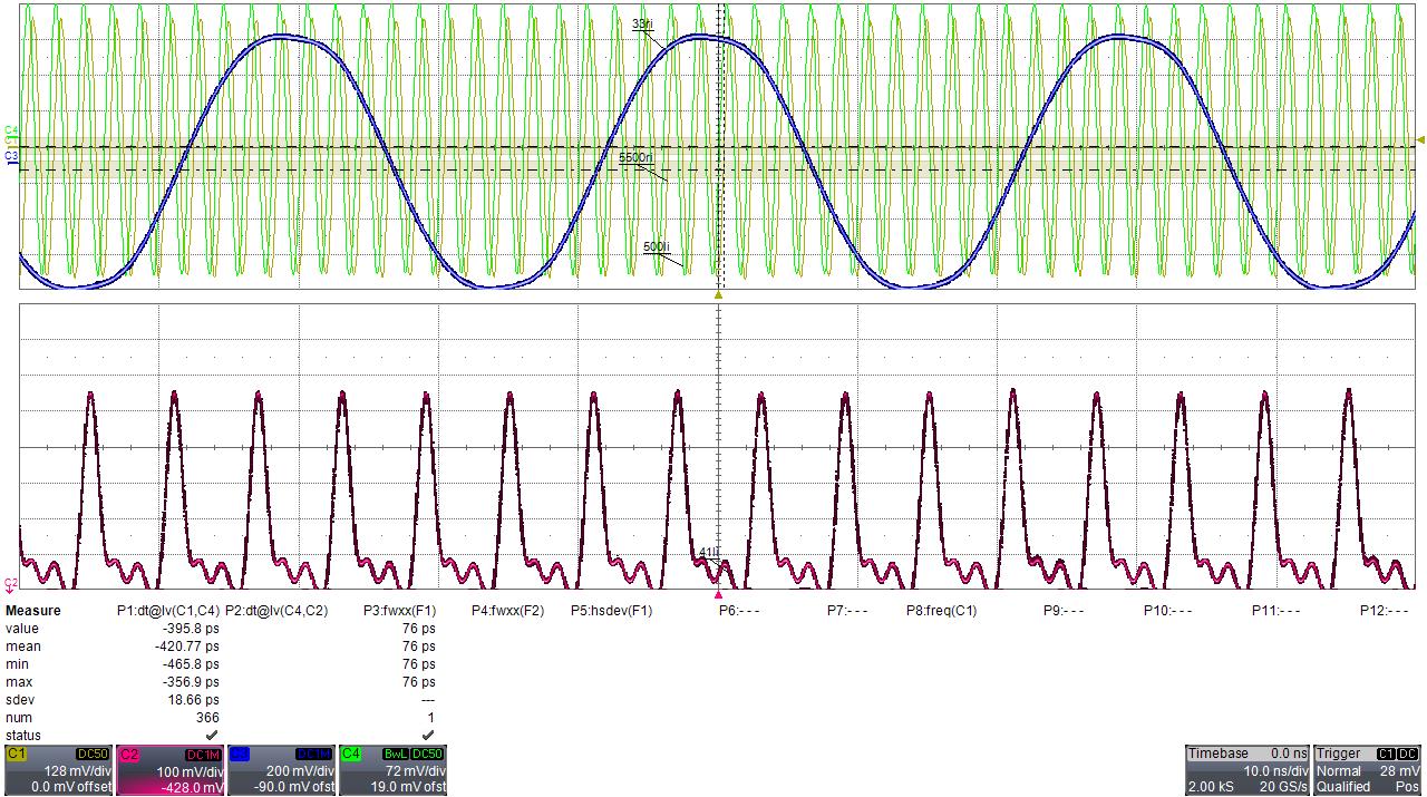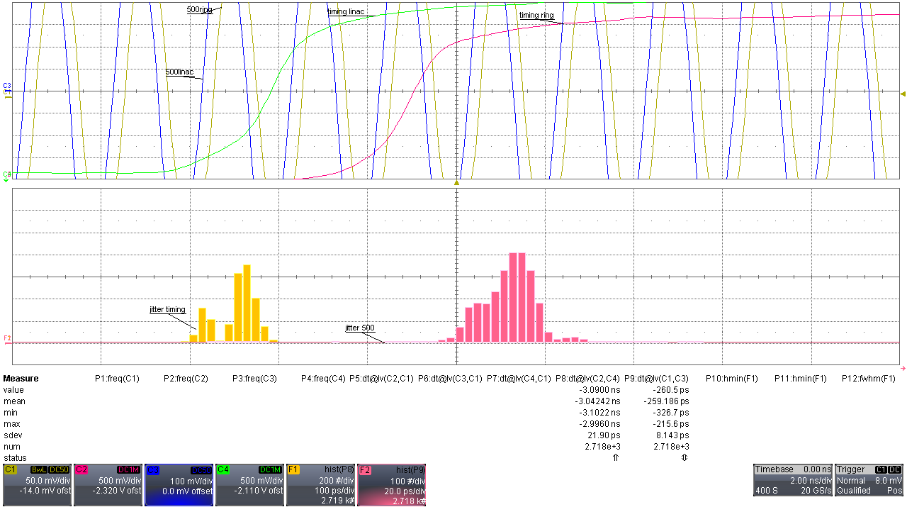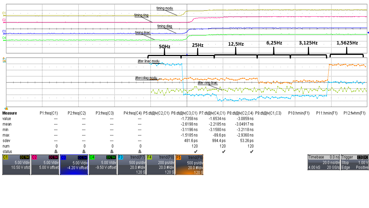 Conclusion des mesures: quand il y a des coups manque, un decalage de quelques centaines de Hz sur le 3GHz linac permet de trouver une frequence ou il n'y a plus de coups manques. Un tel decalage est probablement transparent pour tous les autres systemes. Ce resultat est valide pour une frequence anneau au moins entre 499.9905MHz et 500.250MHz. A 500.250MHz le jitter observe etait inferieur a 10ps entre les deux 500MHz sur une duree de 6h (cf entree elog separee).